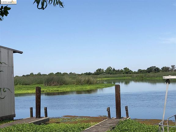 Charming 2 bedroom 1 1/2 bath home with open concept kitchen/living area situated on the Delta This home is abundant with potential. Large two car detached garage with half bath and separate storage shed. Lots of natural light yet shaded nicely by all of the trees. Nice Grassed Levee area to enjoy beautiful sunrises and sunsets and your own boat slip with access to the Delta.