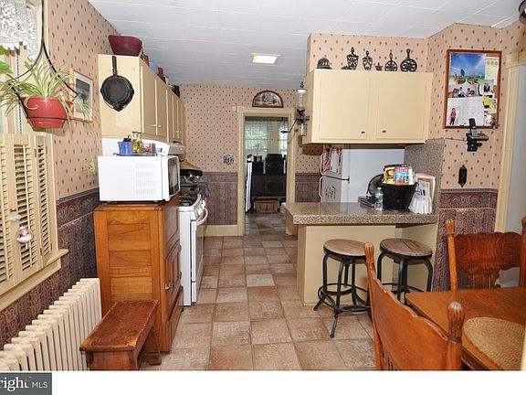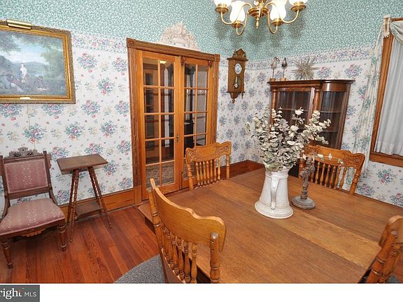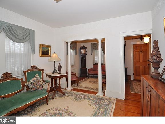 Old world charm exists in the 3 bedrooms, 2 full bath colonial sitting on 1.46 acres backing to Kinkora Creek that leads to the Delaware River. Enter into the front foyer flanked by both formal dining and double parlor with French doors, parlors are separated by rounded pillars. The first floor has 9 ft. ceilings, custom molding, and yellow pine planking floor. The first floor rear of the house encompasses living room, dining room, laundry room, full bath, large eat-in kitchen and family room with ceramic tile flooring and custom molding. The 16 x 14 elevated deck comes off the family room and overlooking the wooded area with views of the river. The second floor has all bedrooms plus the second full bath and walk-up attic. Other features are a full walkout basement, 2 car detached garage plus carport and security system. (Above ground pool in the "as-is" condition). New roof 2008. Commercial possibilities located on RT 130