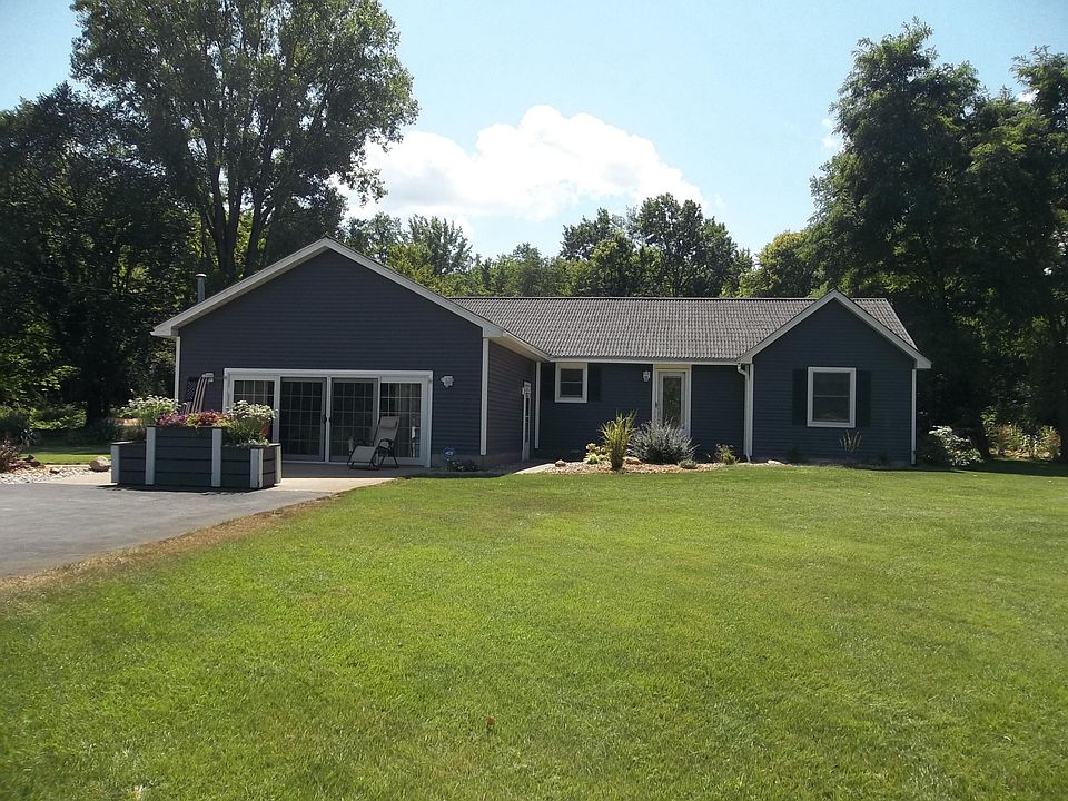 CHECK OUT THIS BEAUTIFUL SETTING ON 5 ACRES, WITH 3 STALL GARAGE IN FRUITPORT TOWNSHIP. The setting here is a dream!! There are 5 full acres featuring a decor pond, firepit area, back patio, front patio, shade trees, underground sprinkling, flowering plants, with beautiful woods behind. This 3 bedroom, 2 1/2 bath home has over 2100 square feet of finished living space features 2 separate living spaces; the traditional living room as well as an extra-large 600 sq ft Game Room or Man Cave whatever you want to call it! The primary bedroom has its own en suite with attached bath and walk-in closet. Then there are 2 other bedrooms across the house with another full bath. This is truly a beautiful home!! Call today for your private showing!! Buyer to verify all info