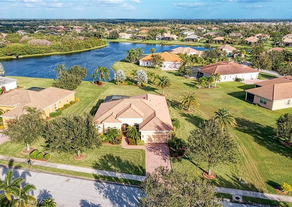 Florida lifestyle to the fullest in this beautifully maintained , pristine condition with four-bedroom, 3-bath plus den, 3 Tandem garages, is located at more than 1/2 Acres lot with pool over looking with spectacular lake view and private backyard at Country meadows features a formal dining and living room, family room, with tile floors throughout the specious kitchen that includes 42" dark cherry cabinets and granite countertop and all stainless-steel appliances that refrigerator is about 2 years old. Upon entering through the brick driveway and mature gorgeous landscaping as you enter through the beautiful double glass entry door will notice the location of the prime lake view lot and upgrades such as fixtures, high ceilings, crown moldings and all windows been replaced to impact windows except the sliding doors and entry door and pool bath door. Master bedroom and den has wood floors and the other bedrooms has no carpet as well. This Fantastic home is located at desirable Country Meadows, great Subdivision with NO CDD, deed restricted with low HOA fees as $315 semiannual, close to 1-75, shopping mall, restaurants, medical facilities, and minutes away from Lakewood Ranch area and half an hour drive to the most beautiful beaches in Florida. This exquisite home has it all to enjoy Florida lifestyle.