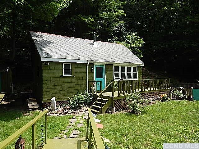 Enjoy picturesque vacations and relaxing solitude in this enchanting and charming country cottage. A wooden foot-bridge over a pretty stream leads to the sun-dappled yard, flower beds and private tree-protected setting. Inside the cathedral-ceiling great room with walls of glass makes a bright, light-filled space for intimate moments with a few friends or a curl-up in nature with a good book and meditation tape. Toasty woodstove comfort in the winter; gas heat and electric back-up. A beautiful babbling brook borders the yard and sings its butterfly filled song while you're dining al-fresco on the deck or doing cook-outs with friends. A pretty, natural unspoiled location on a quiet country by-way between Hudson & Chatham. Enjoy total privacy yet easy access to fine dining & cultural activities. The land has enough acreage and road frontage to meet town requirements for sub-division. All-in-all, a sweet retreat for the artist, writer or mystic seeking a break from city life.