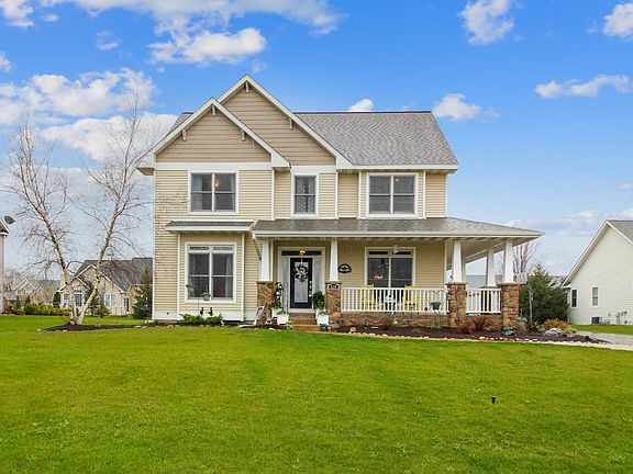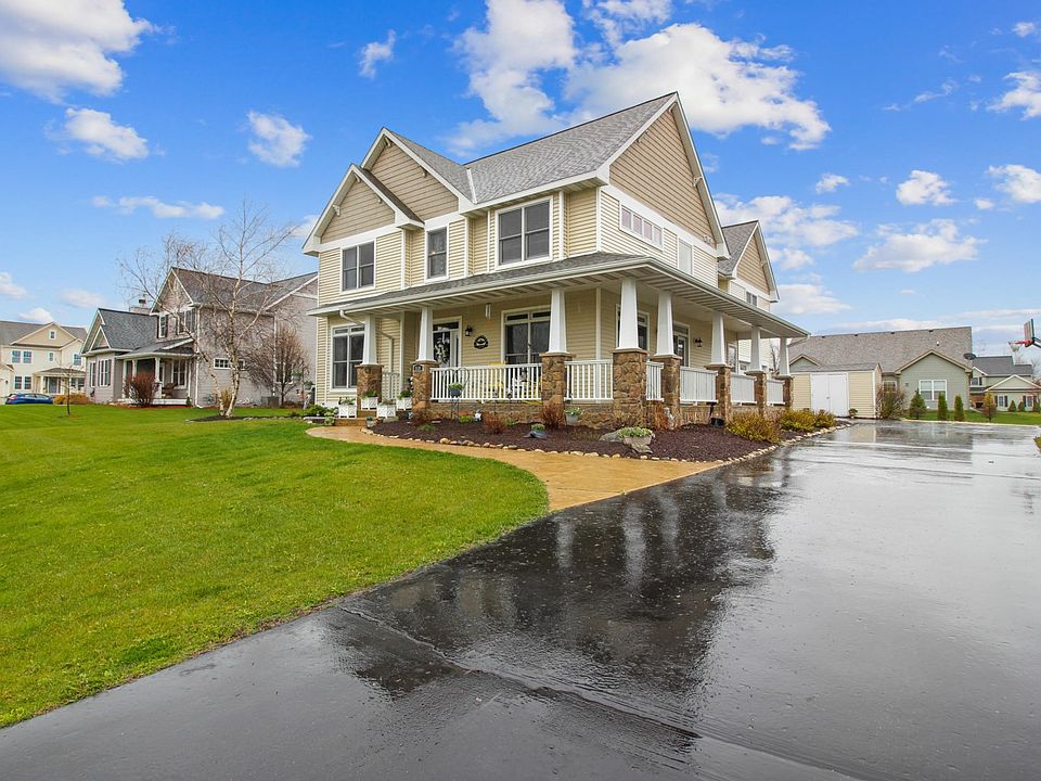 Rare find in Prairie View - Custom Craftsman style home with welcoming wrap around porch. Once inside the large foyer, you know you're home. The spacious eat in kitchen features stainless steel appliances, granite counters and a breakfast bar. The floor plan flows smoothly around to the family room warmed by a two sided gas fireplace shared with the private den/office and the sizable dining room which is made for gatherings or entertaining. Upstairs, paneled french doors open to the master suite. Two generously sized secondary bedrooms, a teen suite and large laundry room complete the 2nd floor. The basement is comprised of several rooms including a game room with dry bar, rec room and space currently used as a home gym. New roof and garage doors 2018. New carpet and paint 2020.