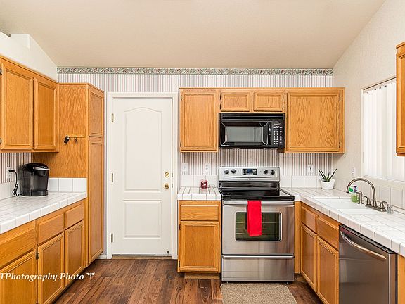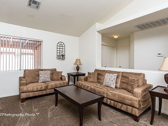 This 3 bedroom 2 bath 2 car garage home sits on a beautifully landscaped corner lot with amazing mountain views and no HOA's! Fully furnished with neutral color scheme throughout. Spacious bright kitchen of stainless steel appliances, plenty of counter space and open dining area. Master bedroom is spacious with large walk in closet. Beautiful maintenance free, fully fenced backyard with huge covered patio. Plenty of room in the backyard to house an R.V. A must see home!