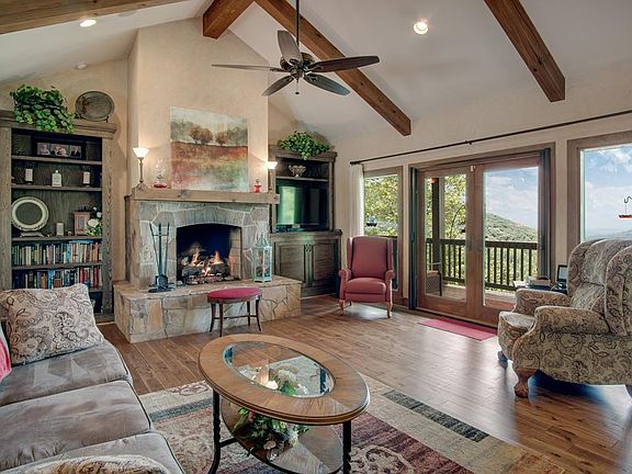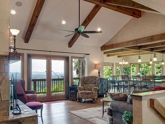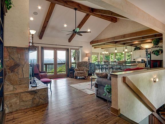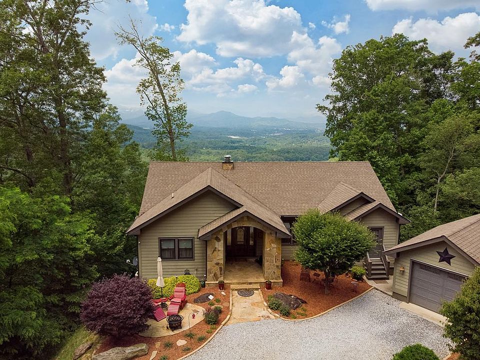 Enjoy BREATHTAKING mountain views from any vantage point inside or outside of this luxurious mountain home. From the moment you step inside, the quality is evident. Open floor plan with new imported Acacia wood floors throughout most of the main floor, to the stacked rock fireplace with built-in cabinets on each side, to the master suite that has a huge closet with a large ceramic tile shower & claw foot tub & a new cabinet & sink w/a gorgeous granite countertop. The kitchen is spacious w/ a beautiful butcher block island. Even the front door is hand made with a beautiful real stain glass window. Enjoy the sunsets off of the porch both on the main level & lower levels then go to sleep w/ the lights of Franklin below. The lower level has 9 ft. ceilings w/ large family room w/ a wet bar. The two bedrooms have a jack'n'jill bath + a bonus room currently being used as a gym. Plus a room for storage. 1 car garage + 2 car carport & a full home security system, whole house generator & home stereo system are just some of the perks. It sits on 2 lots, 5.08 acres to ensure privacy to make it peaceful + quiet. You will have a place that offers a true escape from the stresses of modern life.