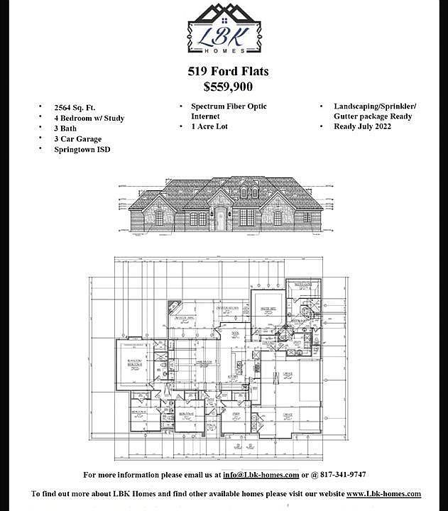 Traditional style home by LBK Homes on 1 acre, Schools very close to neighborhood. This home is featuring a 4 bedroom, with study, 3 bath and 2 car garage is set with an open concept in mind. Interiors include a warm entry foyer, lg wooden beams throughout fam room, cable tv wiring, Nextlink Fiber optic for high-speed internet, large center island, stone countertops, stainless appliances with double ovens, gas cooktop and gas starter on interior fireplace. Master ste. has its own vanities, separate shower and a large walk-in closet. Indoor & outdoor fireplaces. The exterior of the home will also include a landscape package and gutters. Underground Electric. Stop and see if this could be your dream home!