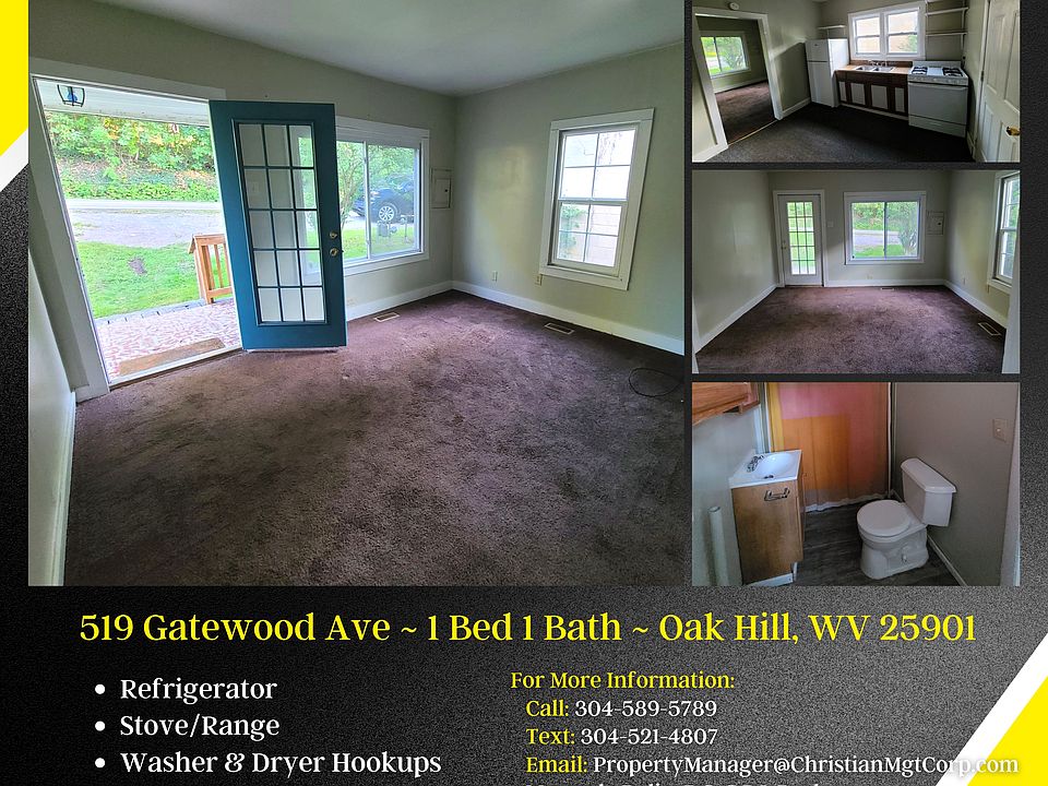 519 Gatewood Ave ~ 1 Bed 1 Bath ~ Oak Hill, WV 25901 RENTAL ONLY: Security Deposit: $625. Can be made in payments if needed. Monthly payment: $625/month. No utilities included. Sorry, this home is not HUD approved. This 1 bedroom 1 bath home located at 519 Gatewood Ave in Oak Hill, WV sits on approximately .15 acres just inside Oak Hill city limits, convenient to shopping, banking, and more. This home features covered front porch, washer and dryer hook ups, and low maintenance yard. Sorry, our lease-option program is not available on this home. Christian Management Corporation Office Hours: Mon-Fri 9:00AM-5:00PM & 10:00AM-2:00PM the 1st Saturday of every month You can view THIS property 7 days a week! Pets will be considered on a case by case basis with fee. Clean, safe, quiet, crime & drug-free are our priorities for our residents! We support Equal-Housing Opportunities! Good people with good, bad, low, or no credit but stable employment or Social Security are welcome. -MUST pass background check -NO evictions in the last 7 years -NO sex offenders Is this property not what you are looking for? View our other available #homes, #mobilehomes, #apartments, and more on our Facebook or our website!