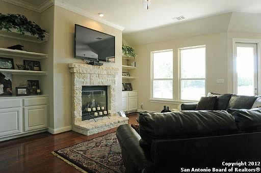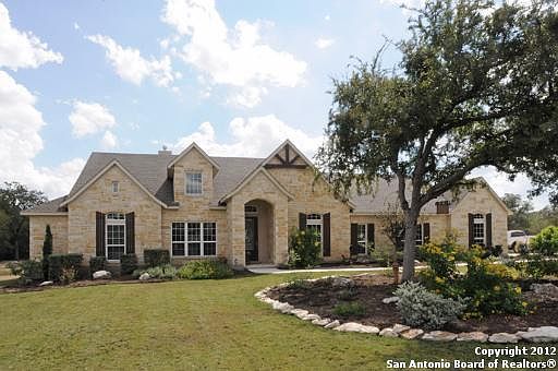 Gorgeous custom hill country home on 1 acre. Great curb appeal greets you with manicured landscaping and beautiful mature trees. Smart floor plan includes stunning wood floors and split bedrooms. The huge kitchen features granite counters and island, stainless appliances, gas cooking and a walk in pantry. It also boasts a 3 car side entry garage. The home is Energy Star Certified and includes an air filtration system. HOA amenities - pool, BBQ, volleyball, soccer and fishing on creekside walking trails.