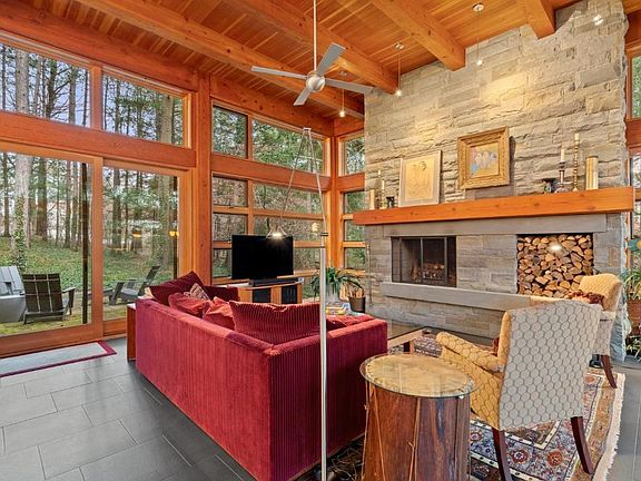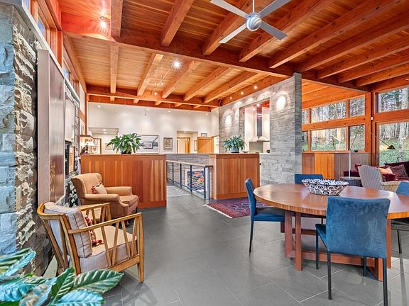 Experience the best of modern living, architecture and design in this incredible home. Step into an ample foyer with a staircase floating along a custom concrete wall. Take the stairs or elevator to the stunning second level. Dramatic exposed beams glow in the daylight that pours in from the floor to ceiling windows. The ceilings, windows, doors, and cabinets are all natural Douglass Fir, the two story concrete wall accents and offsets the warmth of the beams. Privacy amongst the trees in the open concept level. Clutter free kitchen with spacious walk in pantry. Primary suite with spa like bath, bamboo floors and luxurious walk in closet. Second bedroom upstairs with attached bath, third bedroom on the first floor currently used as an office. Radiant floor heat throughout. Two car heated garage & wine cellar complete the first floor. Enjoy unmatched tranquility from the oasis in your backyard. Paths along the babbling brook spanned by two bridges with two stone waterfalls. Exceptional!