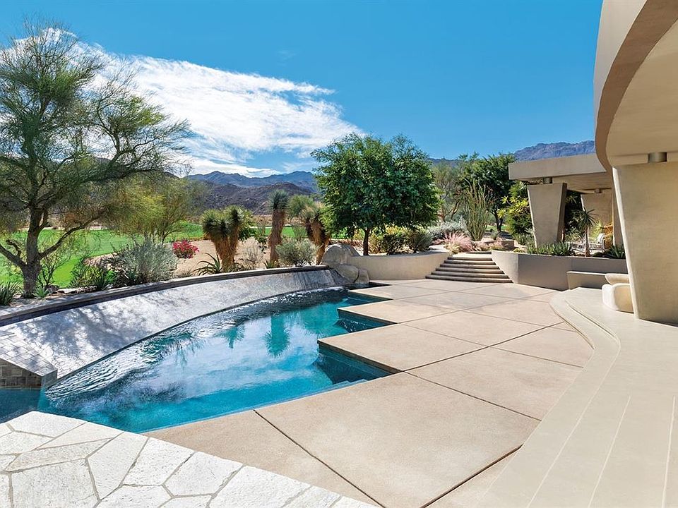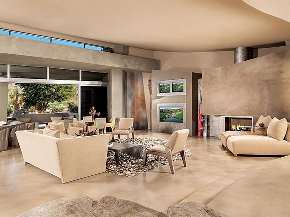 This unique home possesses a tranquility that blends desert inspired textures and organic colors with flowing architectural lines to create a calming desert retreat. Great Room with vaulted ceilings, natural boulders inset in polished concrete floors, multiple seating areas, custom furniture, and cast concrete fireplace that anchors the sweeping sculptural space. Stackable sliding walls of glass bisect the indoor-outdoor, tiered wet bar with custom bar stool seating for eight. Outside, the entertaining patio includes a large pool with artfully designed, ceramic tile waterfall that delivers the tranquil sound of flowing water. Built-in banquette seating and custom furniture lead to a sculptural outdoor fire pit, dining terrace, and integrated bbq center. Desirable south facing exposure overlooks the Canyons Course 13th fairway. This home has been described as a livable piece of art. Must be seen to be appreciated.