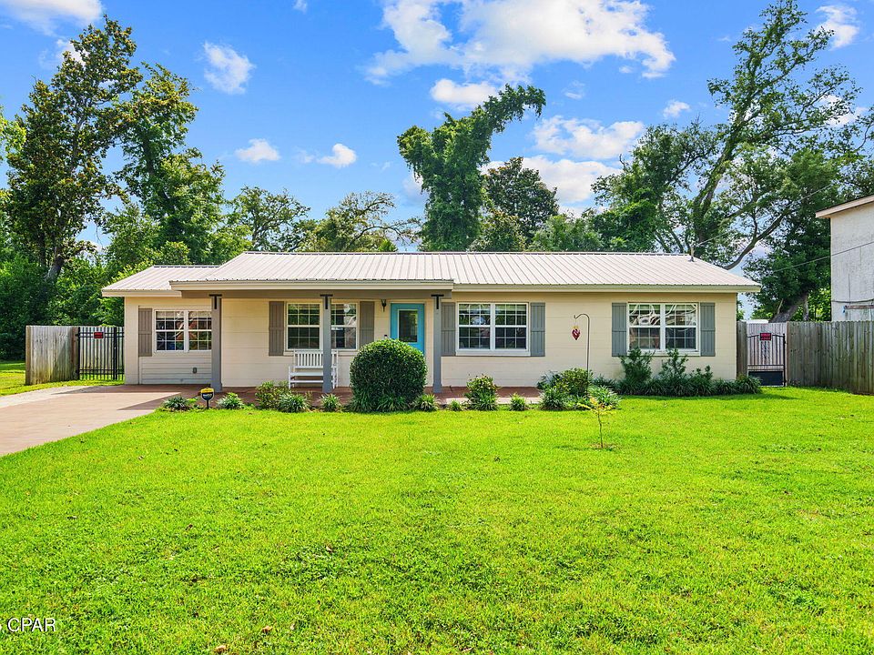CURRENTLY UNDER CONTRACT, SELLER WILL CONSIDER BACKUP OFFERS Beautiful 3 Bedroom/2 Bathroom home with METAL Roof located just off Tyndall Pkwy minutes to shopping, restaurants, Tyndall AFB & more! Interior showcases an open-concept floor plan featuring a spacious living room with beautiful natural lighting, lvp flooring, crown molding, and recessed lighting throughout. Kitchen features an eat-in dining area, deep stainless steel sink, stainless steel appliances, tile backsplash, and built-in pantry. Just off the dining area sits the laundry room, and converted flex room. Secondary bedrooms and full guest bathroom featuring a tiled shower sit down the hall next to the master. Master bedroom and en-suite feature a tiled shower. The exterior showcases a covered front porch, large covered back patio, fenced backyard, and shed on slab. Call to schedule your private showing today! All Measurements approx. buyer to verify if important.
