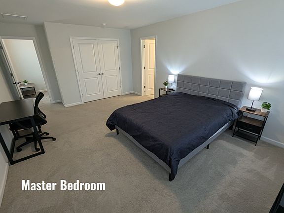 Master suite featuring a private bathroom and walk-in closet, fully furnished with a queen bed.
