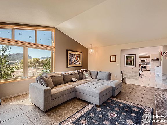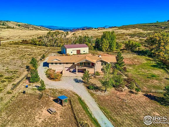 Nestled amidst the picturesque foothills of the Rocky Mountains, this custom built home sits on over 35 acres of sprawling natural beauty. Peaceful outdoor living with two large covered decks providing amazing views of the scenery and wildlife. Spacious kitchen and attached dining area offer direct access to the deck. Cathedral ceilings in the living room with cozy brick wood burning fireplace. The primary bedroom is separated from the other bedrooms for ultimate privacy and offers an updated bathroom. The lower level could provide a multi-generational living situation with 2 additional bedrooms, bathroom and large family room. This home offers 2 attached and heated garages, one for each level of the home with over 1700 square feet of garage space. Additional features include: updated windows throughout the home, a 1900 square foot outbuilding/shop, fenced pasture and more! Close proximity to TPC golf course and Carter Lake.