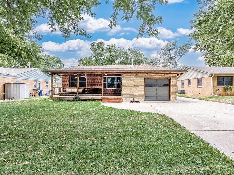 Welcome to your new home in Derby, KS! This 3 bedroom, 1 bathroom, brick/ limestone ranch is well-maintained and features manicured landscaping, a welcoming covered front porch, and a one-car attached garage. In addition, there's a spacious 24x34 two-car detached garage, perfect for extra storage or a workshop. Inside, you'll find a spacious living room and an eat-in kitchen. Sellers are agreeable to transferring the Klipsch speakers and Denon receiver neatly wired in the living room for a fantastic entertainment experience. You'll find the 3 bedrooms on the south end of the home alongside the bathroom. Major updates in 2024 include a brand-new roof, gutters, and American Standard HVAC system, ensuring comfort and peace of mind. Located in the desirable city of Derby, this home is close to shopping, restaurants, and other amenities, offering convenience and a great community to call home.