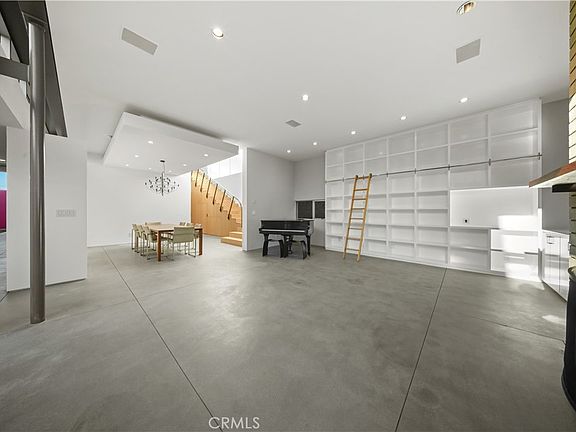 With four bedrooms and four-and-a-half baths, the design celebrates both artistry and functionality, appealing equally to the entertainer and the collector. The main level unfolds in light-filled openness framed by Fleetwood windows and doors, polished concrete floors, and skylights that wash the interiors in natural illumination. A custom-built bookshelf display, Rumford fireplace, and designer chandelier suspended from a dropped ceiling add thoughtful architectural nuance.