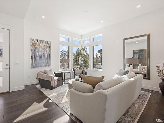 This recently built, open concept, modern home located in the gated Village at Castle Pines neighborhood offers breathtaking mountain and sunset views, coveted convenience to surrounding amenities, and a lock-and-leave lifestyle. As you enter the residence, you're welcomed into a light-filled, spacious living room sitting adjacent to the amply outfitted chef’s kitchen including quartz counters, extended island with seating for 4, a Fisher & Paykel built-in refrigerator, Bosch oven, and wine fridge. The inviting family room boasts soaring ceilings, and a cozy gas fireplace. A dual entry corner NanaWall system connects the family room and kitchen to a sizeable, covered deck with automated shades and gas grill, creating seamless indoor | outdoor living. Featuring twofold layered blinds with both sheer and blackout options, the primary suite includes a custom barn door entry to the spa-inspired bathroom with quartz counters, glass-enclosed shower, and walk-in closet with direct laundry room access. The powder room, thoughtfully designed laundry | mudroom, and garage with epoxy-sealed floor complete the main level. The bright and inviting walkout lower level showcases a stunning custom wet bar with illuminated shelves, quartz counters, wine refrigerator, and ice maker. Extending the indoor living space outside, the recreation and media room opens to a second patio. Two generously sized bedrooms - 1 used as an office and another with an en suite bathroom - provide comfort and privacy, while an additional full bathroom and ample, finished storage | flex space with built-in shelving complete the well-appointed lower level. Modern conveniences, including automated blinds throughout, dimmable LED lighting, and an EV-ready garage, make this home as functional as it is luxurious. Located steps away from community pools, sport courts, a private fitness center, trails, restaurants, and shopping, this one-of-a-kind residence blends luxury and convenience in all the right ways!