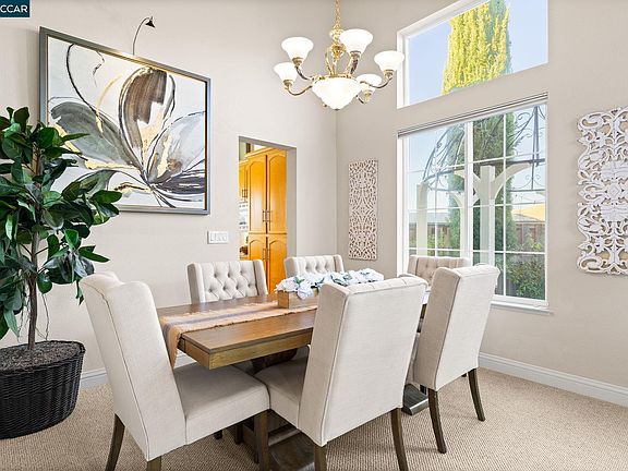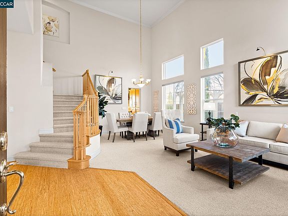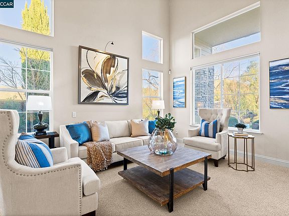 Stunning Oakhurst smart home nestled in the picturesque Mt. Diablo foothills. Enter the elegant living & dining area with soaring ceilings & natural light creating an inviting ambiance. The dream kitchen, with its large island, SubZero fridge, dual ovens, 6-burner Wolf range, warming drawer, wi-fi faucet & wine fridge, flows seamlessly into the family room, featuring a stone fireplace, built-in cabinet & sliding doors that open to the backyard for indoor-outdoor living. Main floor offers a versatile office/bedroom with a temperature-controlled wine closet & full bath. Upstairs, the luxurious primary suite offers a retreat with a gas fireplace, built-in speakers, dual closets, sitting area & spa-like ensuite featuring heated floors, a soaking tub & dual sinks. Two more bedrooms share a hall bath; one expanded with built-ins, ideal as a hobby room or guest space. The backyard is ideal for relaxation & entertaining, with a fire pit, pergola, birdhouses, fountains, gas grill & valley views while drought-tolerant front yard with a rock fountain completes the outdoor spaces. Additional highlights: owned solar, art lights, 3-car garage, laundry room & smart features like automated blinds, thermostat & sprinklers. Close to downtown Clayton, Mt. Diablo trails & Oakhurst Country Club.