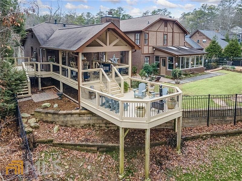 *** TWO SEPARATE PARCELS ARE OFFERED TOGETHER ON THIS LISTING.*** Farmhouse in the suburbs! This brick Tudor is sitting on 4 acres in a Top Rated School District. This unique listing allows an elevated Outdoor Living Lifestyle with expansive porches, unending land and privacy, a She-Shed, multiple fenced-in areas, and level landscaped spaces. The well-planned layout and design of this lovely home allows its occupants to "Live Big." It has been meticulously maintained; the roof, driveway, and systems have all been recently replaced. From the main level, walk out onto a sweeping Covered Porch and feast your eyes on Willeo Creek winding through 3.6 (fenced) wooded acres. The porch has an uncovered area as well and wraps around to maximizing usable space. The eat-in kitchen boasts KitchenAide double ovens, a separate gas cooktop, white cabinetry and granite counter tops. A walk-in pantry adds an enormous amount of storage and is thoughtfully located off of a Butlers Pantry doubled as a full Laundry Room. Double doors that open wide to the porch are great for flow and entertaining. The living room overlooks the banquet size dining room with a gas fire place adding to the room's ambience. Downstairs, a sunlit family room with a wet bar, fireplace, and a half bath allows more space to gather. A sunroom creates additional flexible living space that can be used as an office, yoga/reading room or art studio. Upstairs, the oversized master has an ensuite bath with a linen closet and a large walk-in closet. Two ample-sized secondary bedrooms both have double closets. This property is truly a nature lover's/outdoorsman's delight. The 3.6 acre parcel has NO HOA, use as you please. Grow vegetables and herbs in the constructed beds. Bring your Livestock. Goats have roamed freely with nearly 3 acres of fencing. Chickens have roosted in the Chicken Coop with running Water and Electricity. A short jaunt down a quaint path finds the "She-Shed" and fire pit where hours can be idled away with resort like views. Located Two Miles from Downtown Roswell, this home is a unicorn for the Buyer who is looking for country living with suburban amenities. Relish your privacy while taking advantage of schools, stores, and convenience. Easy access to 400 and the Chattahoochee River.