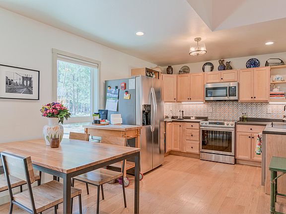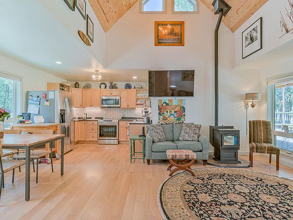 Experience quality living in this one-level home on 1.56 acres in the Ponderosa Pines neighborhood. Featuring beautiful wood floors and tongue and groove pine throughout, the home boasts high ceilings and an adorable attic sitting area. Enjoy warmth and efficiency with a pellet stove, triple-pane windows, and a durable metal roof. The bathroom is elegantly designed with tile floors and a tile tub/shower. The kitchen offers maple cabinets, a tile backsplash, and stainless-steel appliances. Outside, you'll find two storage sheds, 24X36 shop, covered patio with pavers, a dog run and a fenced yard. Close to the National Forest and the High Lakes.