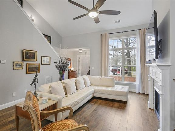 All RENOVATED! THIS HOUSE IS LIKE NEW! Open spacious plan w/cathedral ceilings up to 18ft in the family room with a fireplace. The kitchen has exotic white ice granite countertops, backsplash to the ceiling, new smart stainless appliances and sink, white cabinets, kitchen open to the dining room. Master on main with walk in closet. The second floor has two spacious bedrooms with a full bath. Sunroom leading out to a private wooded & fenced backyard oasis featuring fire pit, pond & private access to walking trail that leads to a fishing creek. Nice cul-de-sac street in a great community with amenities that includes club house, exercise room, pool and tennis.