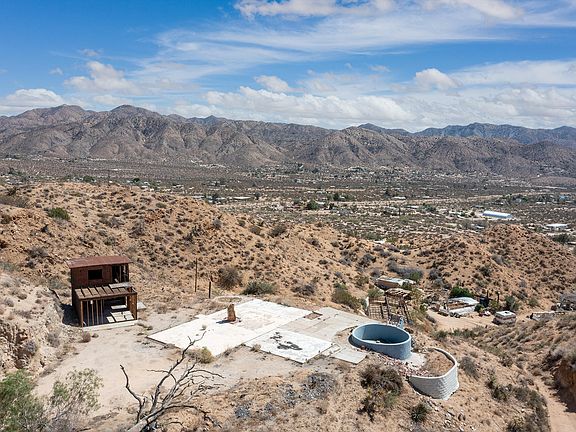 5 acres with a panoramic hilltop view and a magical private valley. A long private driveway leads you up into the clouds, where a slab and garage still stand. The property once had a permitted manufactured home that burned down years ago. Now it's ready for you to build your castle in the sky. Water meter, legal access, power pole, graded, multiple building sites and double gated. County may allow for two homes and guest homes. Tucked away in this private valley includes several extras. A chain link aviary, greenhouse structure, water tank, and storage building. Collectable vintage Silver Streak trailer. Also an extended canned ham 1960s trailer. This is a great starter package for building a hip luxury compound. Acreage backs up to BLM wilderness land for endless hiking. and added privacy. Horse property. Breathtaking views of Mt. San Jacinto and the Little San Bernardino Mountains. Sparkling city night lights in the distance. Enchanted sunsets. Only 22 miles to Palm Springs. 15 miles to Joshua Tree. In 2021 over 3 million tourists visited the Joshua Tree National Monument. Hot vacation area. 116 miles to Los Angeles. The view and private valley combo is extremely rare. For all questions on building and usage buyers must call the county planners. For all questions on utilities buyers must contact the utilities agencies. Don't Wait! - Call Now! APN: 0580-181-06-0000
