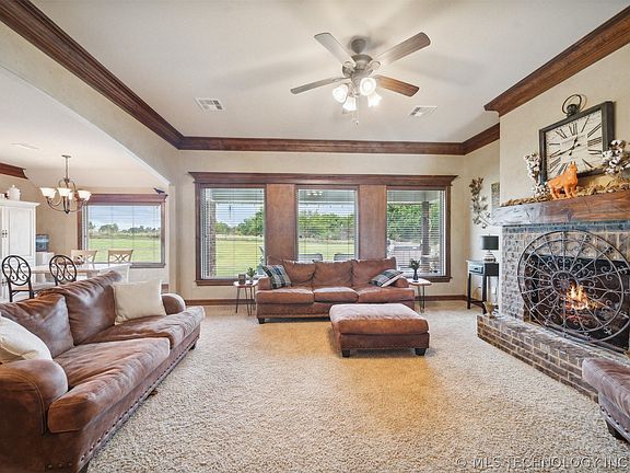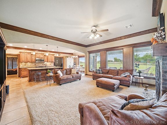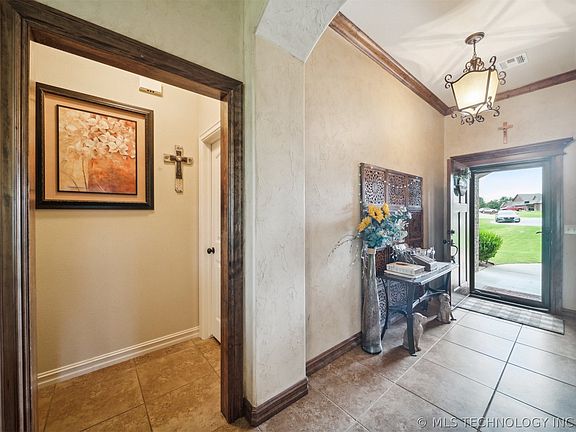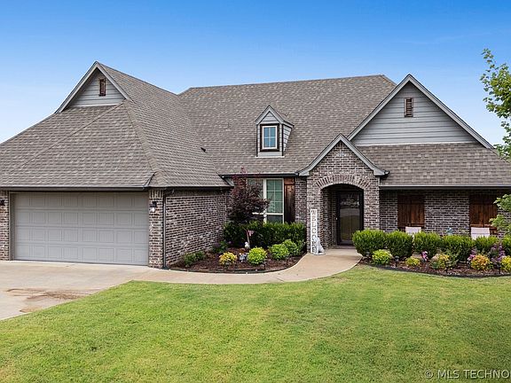 This stunning single-story home, formerly a builder's model, is set on a .69-acre lot backing to private property, providing both privacy and numerous upscale features. This home is located outside of the hustle and bustle of town, but still offers Owasso Schools. Experience luxury with wood floors, extensive crown molding, and an abundance of windows that bathe the home in natural light. The split bedroom layout ensures privacy for all, while the large living room seamlessly connects to the kitchen and dining area, creating an open and inviting space. The versatile office space can easily be used as an additional living space, game room, or guest bedroom, offering flexibility to suit your lifestyle. The oversized master suite features hardwood floors, a walk-in shower, a soaking tub, and a spacious seasonal closet, creating a true retreat. Enjoy the covered patio and extensive landscaping that provide private, serene views—perfect for relaxing or entertaining. An additional garage is permitted, offering options for more storage or workspace. Highway 75 offers quick and easy access to Tulsa, enhancing the convenience of this beautiful home. The Washer, Dryer and Refrigerator are included. Don't miss the opportunity to own this immaculate home that combines luxury, convenience, and privacy in a desirable location.