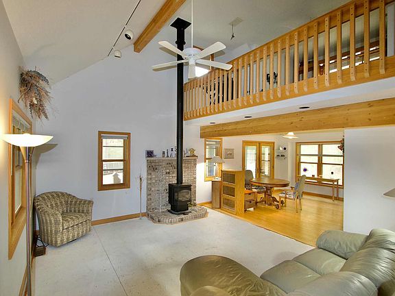 Wrap around covered porchTowering pinesLarge great roomRolling acreageVaulted ceilingGas stove