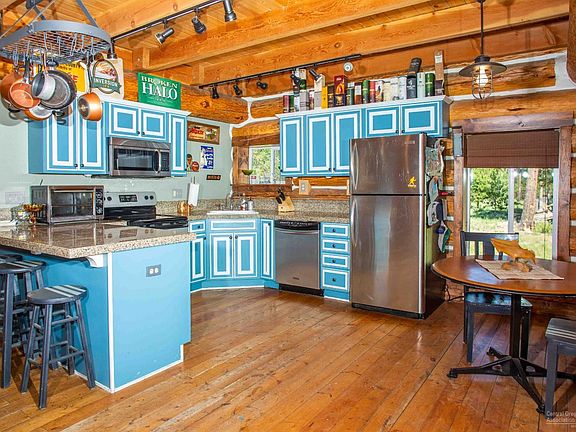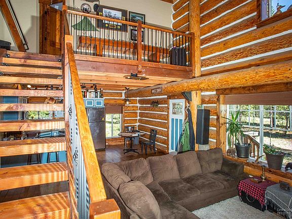 Award winning beautiful log home surrounded by trees! Amazing hardwood floors, ornate solid wood staircase with iron railing. Huge 20' ceilings in great room with gas fireplace for those cold winter nights. Open kitchen w/granite tile counters, breakfast bar and newer appliances. Large bedroom on main floor with full bath. Upstairs is landing area/loft with views below. Huge master suite with double vanities, clawfoot tub and shower. Additional bedroom and stairs to the 3rd floor loft which would be perfect for a kids room, guest or 4th bedroom. Newer covered deck off the back with 220v power for hot tub. Private corner lot on 1.22 acres to enjoy nature and the peace & quiet.