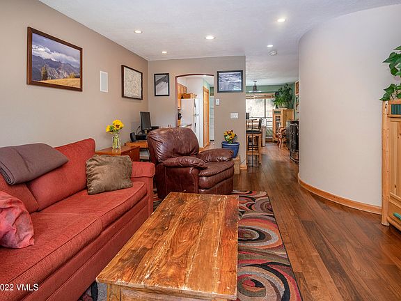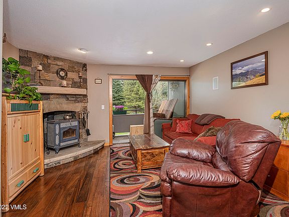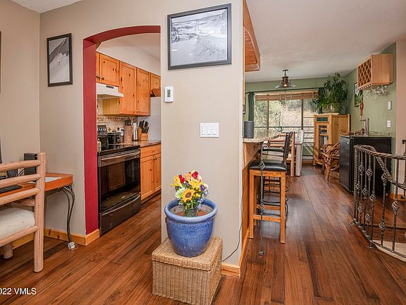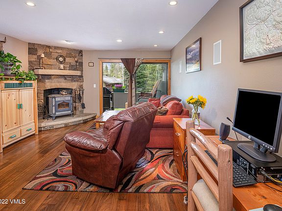 Nestled at the end of the street in a peaceful setting, this upgraded condo overlooks the creek and boasts unobstructed views of the East Vail Chutes. Functional layout includes 2 floors and 2 entrances. Upgrades include walnut wood floors, tile, stone hearth, flagstone patio, granite kitchen countertops, decorative metal railing, and cinema sound ceiling and in-wall speakers. Close to many hiking trails and Town of Vail bus route.