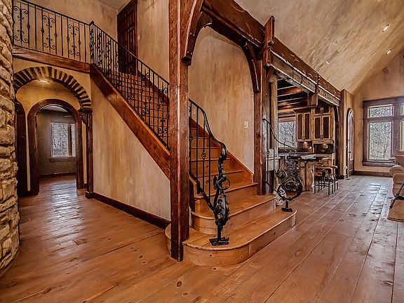 This truly elegant custom built home is overflowing with handcrafted elements, from the hand-hewn beams and doors to the hand rusted walls in the entryway. The main floor boasts massive ceilings with a stone fireplace and stone walls with incredible windows lining the back of the great room allowing for plenty of natural light. The main-floor kitchen features an oversized island with custom cabinetry, 60'' subzero fridge/freezer, dual oven Verona gas range, under counter ice maker, warming drawer and wine rack. Also on the main floor is the oversized master suite with attached sunroom and an exquisite master bath with quartz counter tops, travertine floors, walk-in shower and jetted tub.Downstairs there is another open living room with access to an additional 2 car garage/John Deere roomBoth garages have heaters set up to work with the wood furnace, the home has zoned cooling, additional storage in the attic and is set up so you can hook up your gas grill to the propane line. There is a cable line and electrical outlet on the upper deck so you can hook up a television outside. Out back you will love the screened-in wrap around deck and covered patio with recessed lighting up and down, 2 attic fans, waterproofed wood deck and stained concrete downstairs. Enjoy the lovely acreage on a park like setting. This home is a stunner!!!