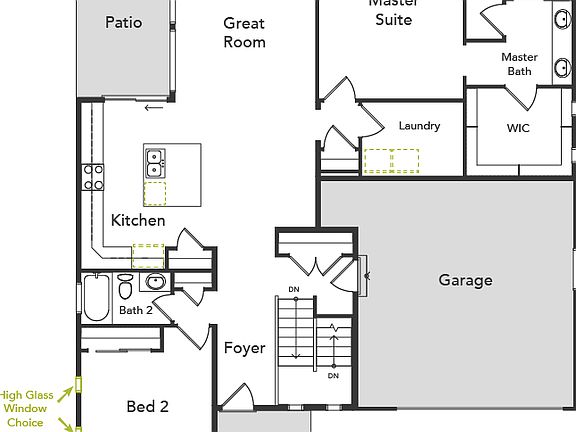 It includes a secondary bedroom at the front of the home, 2 baths, and a large master bedroom with a walk-in closet and spa bath features, and a laundry room located off the master bedroom suite for your convenience.. Framed with a grand window-scape that streams in the natural light is the main level amenities that include the open floor plan for the dining, great room and kitchen. Finally, this home includes an expansive unfinished basement ready to be used as your needs vary.;