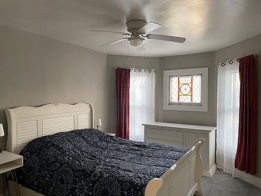 Bedroom with stained glass window- 10 x 14 closet is 6.5 x 2.75