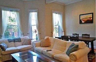 Bright and sunny, renovated 1 bedroom on desirable South End St. Large, aprox 675 sq ft 1 bedroom with modern kitchen and modern tile bath. Huge, sunny, private deck. Bow window in large living room. Central air, washer and dryer in unit. Recessed lights, lots of closet space. Some pets okay with permission. NO SMOKING IN BUILDING