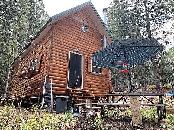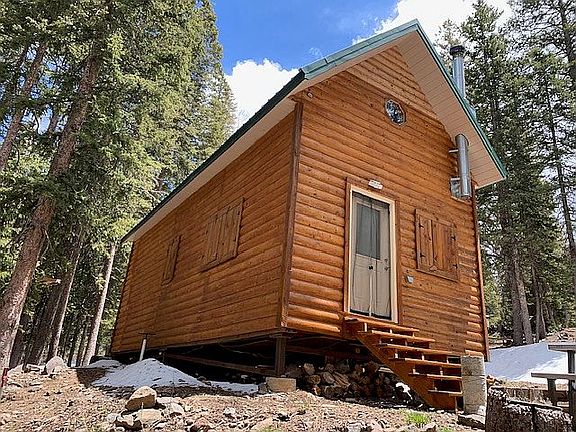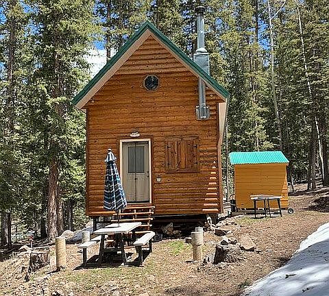 Our cabin is a little taste of heaven. Sitting amongst the tall pines and quacking aspens in a very private setting. Enjoy summer temperatures in the mid 70's, starry nights, and the sounds of nature. The loft is approx. 300 sq. ft. Currently, there is a Queen bed up there. It would fit multiple beds if you wanted to do so. The front room is our office and guest bedroom (with a full sized Murphy Bed). There is one full bathroom, a large kitchen, a propane refrigerator (currently in our guest cabin), and lots of storage. The living room features a wood burning stove, a wall mounted TV, a couch and 2 recliners. The back door opens to a flat area which is perfect for a picnic table. The covered deck no longer has stacked wood on it. It is big enough for keeping your coolers, generator, 2-chairs and a table. The outside window shutters lock in the open position with all windows working as designed.