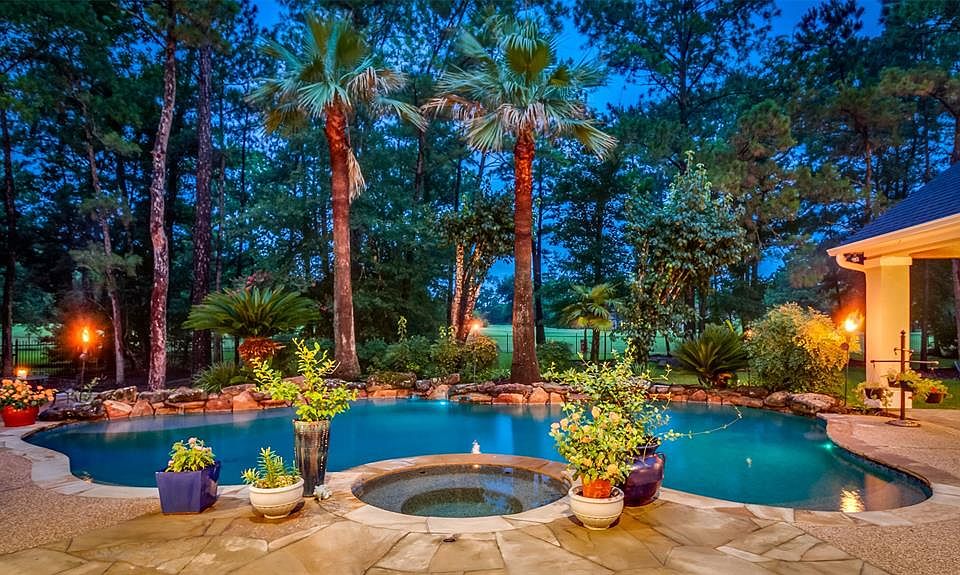 Extremely rare find in sought after Hollymead neighborhood on 9th hole of Woodlands Palmer Country Club. Golf Course Dream Home, 1.5 story, hardcoat stucco with circular driveway & electric gates for added privacy. 5/6 bedrooms, 3/4 bedrooms down. 2 master suites with fabulous Chromotherapy baths & large walk in closets. The secluded study would also make a perfect media room or au pair/in law suite wi/ private entrance, closet, attached full bath & easy access to one of the garages. The almost 1 acre, fabulous golf course view backyard oasis is breathtaking. Spectacular 566 sqft outdoor living paradise, built in 2016, with multiple built in TV's, fireplace, outdoor kitchen, living & dining space. Heated salt water pool with rock waterfall, lights, spa, tanning shelves, fire pit, outdoor shower. The list goes on & on. Gourmet kitchen with open floor plan. Beautiful mesquite & wide plank black walnut or travertine stone floors throughout the home. Roof was replaced 2016. No flooding.