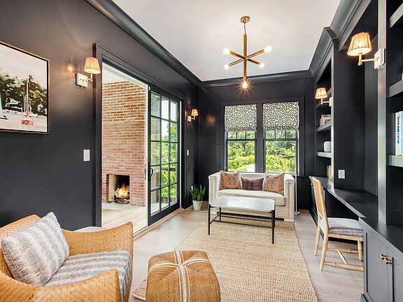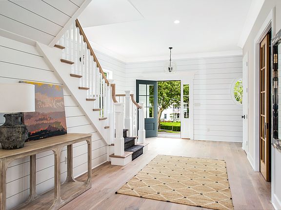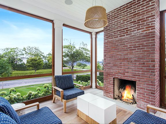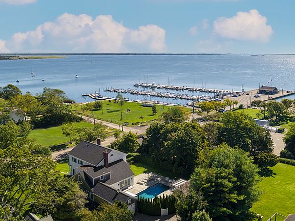 Perched high on a hill, on the sought-after Historic Bellport Lane, this exceptional water view home is a stone's throw from the Bellport Village marina. This custom residence boasts 4,000 SF+/- of living space above grade with 5 bedrooms, 5 full and 1 half bathrooms. The home has been built to the highest of standards with custom millwork, custom wood-paneled walls and railings, and wide white oak flooring throughout. Each level offers high ceilings -10' high on the first floor. Throughout the light-filled home, you will find the finest attention to detail in every space. Beyond the entry is the den/library with double sliding pocket doors for privacy and custom built-ins. Just off the den is a screened porch boasting views of the water and the Bellport marina. The porch features a wood-burning fireplace and a ceiling-mounted, outdoor heating lamp to allow year-round enjoyment. The open-concept kitchen, living, and dining area is ideal for entertaining, offering soaring ceilings with accent wood beams and a gas fireplace. Light pours into the spacious chef's kitchen, outfitted with high-end, custom appliances including a Viking range, a Sub Zero refrigerator, two Miele dishwashers and wine refrigerator, a large marble center island with seating, marble countertops and custom-lit oak cabinetry. The west wing of the house offers two first-floor ensuite bedrooms, both conveniently located with easy access to the pool area. A private staircase leads to one of the two primary bedrooms, with vaulted ceiling and a large bathroom and walk-in closet. A laundry and a half bath in the hall, and a mudroom complete this wing. The light-filled, second primary bedroom is accessed by the grand, east wing staircase. This second main bedroom boasts beautiful water views, custom wood pine ceilings, and a large walk-in closet with custom built-ins. The large, primary bathroom features a spa-like shower, dual vanities, and custom oak cabinetry. This level also offers an additional guest bedroom with a bath and a walk-in closet. The second level is complete with a second, main laundry room, ideally located in the center hall. The secluded backyard is primed for entertaining featuring a 14' x 32' heated gunite pool with lounging area, an outdoor shower, a pool house with a pergola, a storage room, a large bluestone patio, and plenty of space for al fresco dining and larger gatherings. Additional highlights of this pristine home include a 1-car attached, heated and cooled garage, currently being used as a gym, and a full unfinished basement. The home can be accessed either from Bellport Lane or by a private tree lined gravel drive on Academy lane. The residence is close to all Bellport Village amenities from local shops, restaurants, Bellport Country Club. Never miss the Whalehouse Point ferry to Ho-Hum beach as you enjoy its arrivals and departures.
