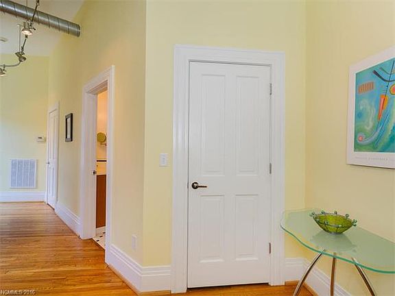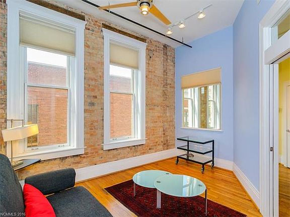 Beautiful loft condo in the heart of downtown Asheville. Walk to everything. Top quality custom fixtures and fittings. Stainless kitchen with eat-on island. Kitchen cabinets/bookcases run full length of North wall. Exposed brick wall, 11.5' ceilings, original red oak floors throughout, ceiling fans. End unit with 11 very large windows on South and West sides. Extensive track lighting for your art. One parking space in secure basement garage. Total custom rebuild in 2006.