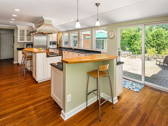 Located on a shaded and peaceful cul de sac in desirable North Stamford, this mid-century ranch-style home on two very private acres offers all the best in country living. Multiple stone terraces offer outdoor dining and relaxation options and large Andersen windows bring the outside light into the home. Great open floor plan, from room to room, is perfect for entertaining. Gourmet kitchen features include granite countertops, two islands (one with a second sink), SubZero refrigerator, Wolf 6-burner stove top and double oven, plus an additional Thermador wall oven and warming drawer. Sprawling master bedroom/walk-in closet/marble spa, home office/library, vaulted ceiling in family room with wood beams, attached two-car garage, central vacuum system and more. All this with shopping and dining in Pound Ridge, Bedford, New Canaan and downtown Stamford just minutes away!
