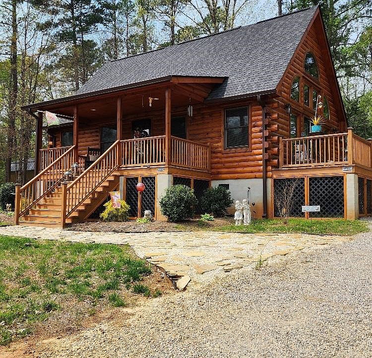 GORGEOUS Log Cabin in Beautiful Lakeshore Plantation Sub! Escape to this 2 BR, 2.5 BA home built in 2021 with Open Floor Plan, GRANITE Counters + Center Island in Kitchen, SS Appls included, Tile Backsplash. Master BR on Main level with 2nd BR on LOFT overlooking Fam Rm with FP. Hardwoods thru out house with exception of LVT in 2nd bedroom. (owner has hardwoods to match to finish that bedroom). This is a gated community and houses sell fast. Deeded slip in the community dock. House apprasied for more than $485K, True log cabin with logs inside and out. Take a look at this gorgeous home! Perfect place to retire. Golf Kart right to community dock! Only a short distance to town and I85 or go other direction towards VA.