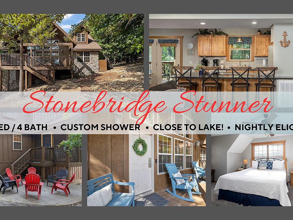 This lodge seamlessly blends rustic charm with modern elegance, offering a warm and inviting atmosphere for your family and guests. Imagine waking up with breathtaking views of the Ozark Mountains. Partial lake view and close to pool and recreation area. With 4 generous bedrooms there's plenty of space for family and friends to gather and create lasting memories. The open-concept living area with vaulted ceilings and a cozy fireplace creates the perfect setting for entertaining or simply relaxing. Stonebridge Village offers residents access to a host of amenities, including a championship golf course, swimming pools, tennis courts, and more. Just a short drive from Branson, you'll have easy access to world-class entertainment, shopping, and dining. Don't miss the chance to make this lodge your own peaceful oasis in the Ozarks.