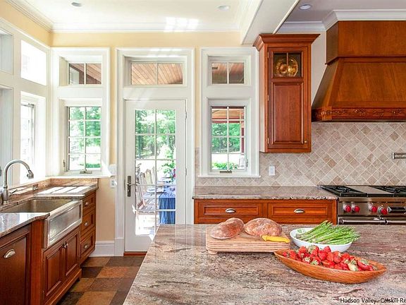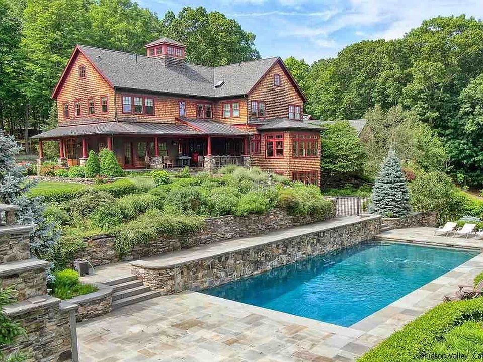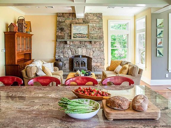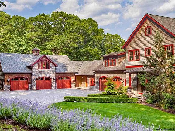 One of Ulster Countys finest large estate properties, on the market for the first time. Located in the designated Historic Kripplebush Hamlet, just outside Stone Ridge and High Falls, this property was created over the last two decades by owners who value high quality, serenity, and complete privacy. You approach the home site on a half mile long paved driveway meandering through the woods and gradually inclining up the hillside to a nicely elevated plateau with incredible southern facing views of the Shawangunks and Mohonk Mountain Lodge. The carefully chosen site overlooks these distant views as well as sculpted meadows, woodland trails, the Kripplebush Creek, a pond, and a 50-foot Gunnite swimming pool with extensive bluestone terraces, and sculptural stone walls. The home was designed in the Craftsman Style of cedar shingle and local stone. Attention to detail prevails throughout, with Brazilian cherry floors, a custom chefs kitchen, Venetian plaster walls, ten-foot ceilings, and much more. The details become the backdrop for the gorgeous site, the inclusive views from most of the windows, and the distinct feel of belonging, and of home. The house provides plenty of room to spread out while keeping the sense of style and cozy spaces. The professionally equipped home gym and yoga studio, and the well-maintained running and mountain biking trails throughout the property will give the fitness enthusiast plenty of opportunity to work out. The two garages (2-Car and 3-Car) have radiant heat and include a workshop area, satisfying even the most distinguished car aficionado. The kitchen is ideal for entertaining and incorporates everything a chefs heart desires; from the butlers pantry, Wolf stove, GE Monogram Refrigerator, to a lovely sitting area with gas fire place, and expansive views from the windows. A door leads to a covered porch area that is simply perfect for BBQs and summer dining. The lovely, beautifully cared-for and quiet gardens surrounding the home and pool extending their fragrant beauty, turning each moment pool-side into a relaxed and peaceful experience. The home, pool, and garden areas are perfectly integrated into the landscape, adding to the notion that even though this can be a fully functional work-from-home situation, with its two home offices and separate guest quarters, the property provides a complete vacation experience from the moment you set foot on its grounds.