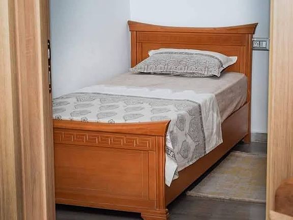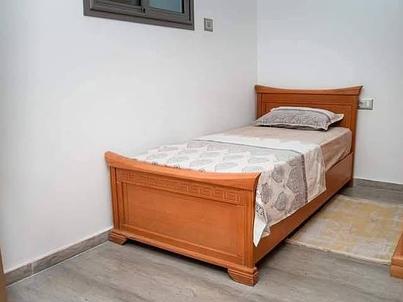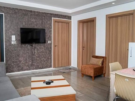 A clean apartment with a wonderful view It features two bedrooms, a living room with a modern kitchen, and a bathroom.