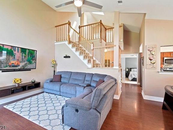 Stone face wood burning fireplace in living room with vaulted ceiling open to loft and a new kitchen are the focal points of this one bedroom condo with garage. Kitchen remodel, in 2016, includes stainless appliances, maple cabinetry and quartz counter tops. Carpet in bedroom and loft, laminate plank in other rooms. Furnace and air were installed in 2019, water heater and washer dryer 2017. This is a second and third floor end unit with an open porch with view of a common green space. All neutral paint, new light fixtures, and blinds. Professional, sanitizing deep clean procedure was completed on this home. Please wear mask, gloves and booties. $60.00 monthly sewer charge, water metered. The Hills community has easy access to route 78, 287, 22, 202 206 and train. 30 minutes to Newark airport.