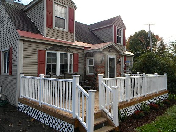 Charming 20th Century Cape in an equally Charming neighborhood on the outskirts of the City of Fulton, NY. 3 bedroom, 2 full bath dwelling with bonus room that could be a 4th bedroom, nursery, craft room or office has many upgrades. New deck, new Trane furnace, updated HVAC and duct work; basement completely remodeled has exercise room, den with dry bar; utility room with furnace, water heater, laundry with mud sink. New lighting throughout, refinished hardwoods up and down, hardwired smoke detectors all sound of one detects smoke as a safety feature. Large first floor master has exterior entrance to private back yard. The property includes a good size garden shed, oversize one car garage, privacy fencing and a great new front deck!! Brick entrance and dormers add charm and appeal to your new home; driveway was enlarged to accommodate 4 to 5 cars. Shady and fenced all around, the back yard is a quiet sanctuary; great for pets, children or relaxing in solitude. Watch the world go by with your morning coffee from the large front deck, perfect for entertaining guests or hanging out with friends. So much to appreciate and very affordable; this property should be on your short list !!