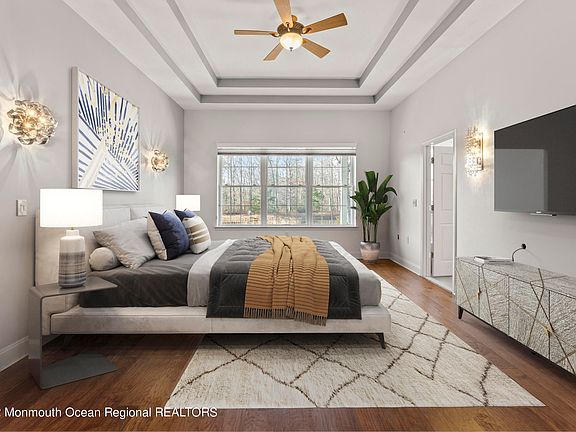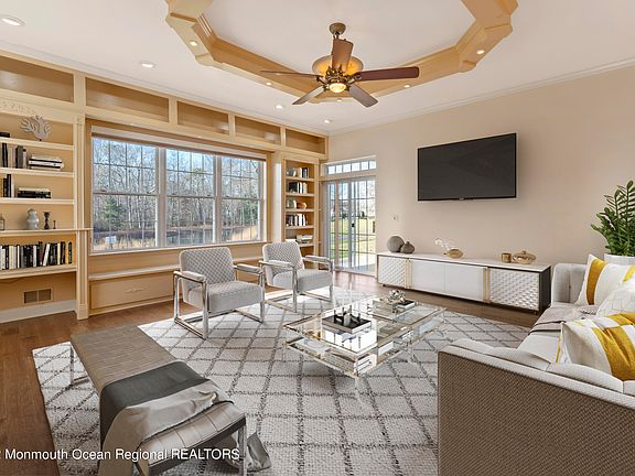 ceiling fan, builtin bookshelves and sliding door to covered porch. Master bedroom with tray ceiling,