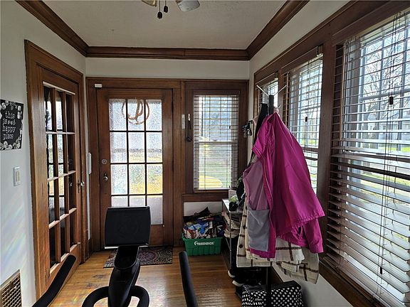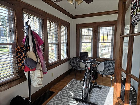 This charming bungalow style cape has a first floor bedroom and full bath with two additional bedrooms on the second floor and another half bath. The enclosed front porch is a great space for your favorite leisure activities or just relaxing with a cup of coffee. The hardwood floors, cozy gas fireplace and natural wood trim are all stunning. Many windows (vinyl replacement) and an open first floor invite lots of natural light. A spacious dining room with connected living room is a great opportunity for gatherings of friends and/or family. The partially finished basement is a perfect spot for a rec room, home office or man cave. The retro style kitchen comes complete with all appliances (including the washer, dryer, dehumidifier and extra chest freezer in the basement). The fully fenced in back yard has a patio, access to the garage and a convenient back door (with mudroom and storage space). The mechanics include an h/e HVAC, hot water tank, updated panel box, and there is even a "wine cellar."