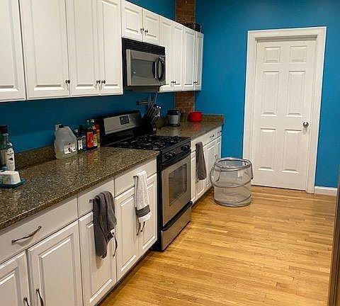 First floor (raised above street level) of a 3 floor building. Lovely space in a great and rapidly developing neighborhood, with a back garden, front and back porches (newly repainted and refurbished), remodeled bathroom, interior French doors, a built-in cabinet in the dining room, natural gas steam heat, recently peaked chimney, and a 12 year old roof in near perfect condition.