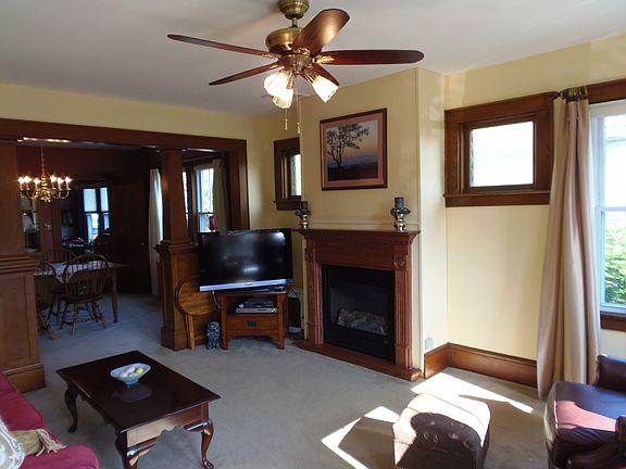 Immaculate 5 BR, covered-front porch Colonial; upgraded kitchen w/cherry cabinets;Spacious LR w/gas FP; HW flrs under neutral carpet; natural gas heat;central air;detached 1-car garage;private backyard Original chestnut trim, molding, solid wood doors throughout; chestnut columns and built-in shelving frame the formal dining room; breakfast nook w/built-in china cabinet; pantry/mudroom with ample storage; two full baths w/ceramic tile floor; updated fixtures; Countless updates and amenities, including: newer tilt-in windows, heated gutters, ceiling fans in all rooms, generously-sized closets in all bedrooms, including huge walk-in closet with organizers; low maintenance vinyl siding for both house and garage; whole house humidifier. Enjoy the beautifully-landscaped yard from paverstone patio in level backyard!