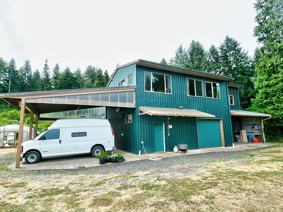 The perfect home and property for the minimalist looking for sustainable living. Lovely teak, cherry & hickory 3/4 inch hardwood flooring, vaulted ceilings, and plenty of natural light. Main level living on upper floor has 1152 sq ft, plus an addition approx. 400 sq finished lower level canning food prep room with 1/4 bath, and bonus room for shop or hobby space and a woodstove, with a dumb waiter to the top floor. Large RV/equipment garage,+ large garage and covered carport areas and an attached greenhouse with a hot tub along with a separate metal building shop. Absolutely stunning views of Alsea River and Bay on a usable 2.89 acres of property with green houses, garden areas, berry patches, orchard with a variety fruit trees, too many to list. Simply a delight to visit this property