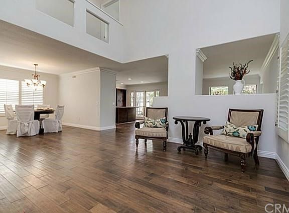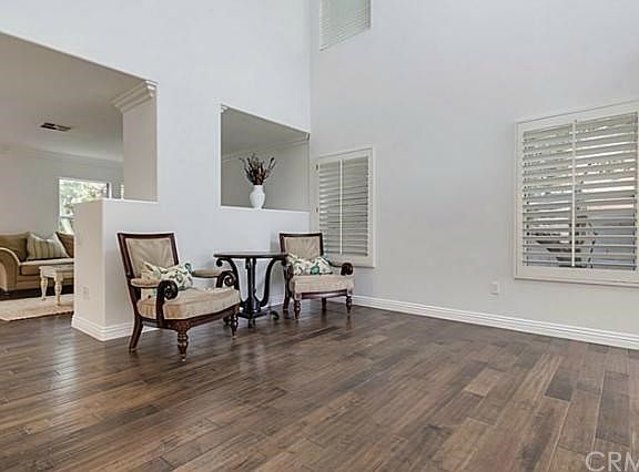Come home to this charming 4 bedroom, 3 bath house filled with interior upgrades in the Vintage Promenade neighborhood of Foothill Ranch. The open floor plan is perfect for entertaining and includes distressed hardwood floors throughout the first floor, crown molding, large baseboards and wood shutters. Relax in the family room by a cozy fireplace and admire the gourmet kitchen which was recently remodeled with dark wood cabinets, granite countertops, large center island, stone full-height back-splash and stainless steel appliances. The living room boasts vaulted ceilings and connects to the large formal dining area. Walk out the french doors and enjoy the afternoon on the backyard patio under the wood trellis. After a long day, relax in your spacious master bedroom that includes a ceiling fan and walk-in closet. The master bath offers dual sinks, a glass enclosed shower and a large oval soaking tub. The secondary bedrooms include mirrored wardrobe doors and a large full bath. Your family will enjoy the community pool and the award-winning Saddleback Valley School District. This home is centrally located to Town Centre, The Market Place shopping area, the famous Whiting Ranch Park and Trail System and the 241 and 133 freeways.