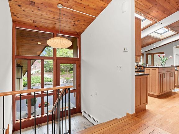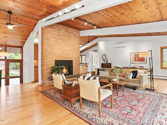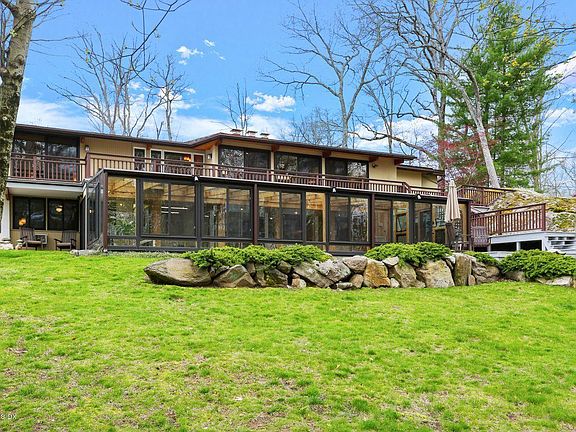Stunning mid-century modern Deck House, secluded on 1.32 lush wooded/landscaped acres only 10 mins to train and downtown Greenwich. This tranquil oasis, perfect as primary residence or weekend escape from Manhattan, features indoor glass-enclosed pool, upper & lower decks, separate heated/AC out-building for studio or office. Vaulted ceilings, open floor plan, skylights, ample sliding doors & expansive decks harmonize with the landscaping to unite indoors with its natural surroundings. The upper level features a spacious master bedrm with en-suite bath, great room with gas fireplace, office & family room adjacent to kitchen. LL includes playroom w/ fireplace, opening to indoor pool for year-round swimming, workshop, laundry rm, 3 bdrms & full bath. Office and studio possible bedrooms.